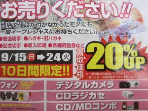 当店では9/15~9/24までの10日間・・・チラシご持参の方にかぎり買取価格20%UP